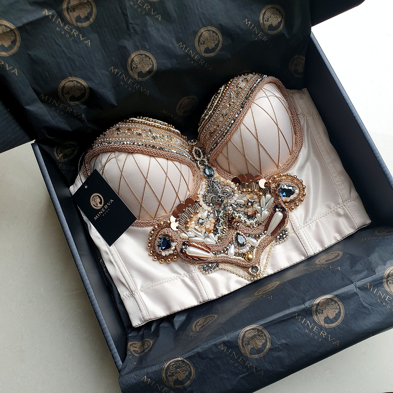 Ich beginne mit der Auswahl der Materialien, die für jedes Korsett verwendet werden. Ich arbeite ausschließlich mit hochwertigen Stoffen und Accessoires, um sicherzustellen, dass jedes Korsett ein langlebiges und stilvolles Kleidungsstück ist. Ich arbeite mit einer vielfältigen Auswahl von Stoffen und Verzierungen, darunter Spitze, Perlen und Schmucksteine, welche meinen handbestickten Artikeln eine unverwechselbare und individuelle Note geben.